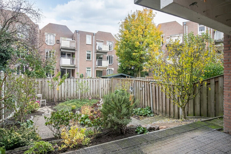 De royale achtertuin is voorzien van twee terrassen, sierbestrating, borders met gevarieerde beplanting en een poort.