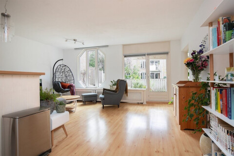 Sfeervolle royale woonkamer met veel lichtinval, welke verdeeld is in een zit- en eetgedeelte en voorzien van een laminaatvloer, sierpleister wanden, radiator ombouw, een vaste kast met 3 schuifdeuren en toegang tot het balkon en de achtertuin. Desgewenst kan het eetgedeelte weer gebruikt worden als extra slaapkamer.