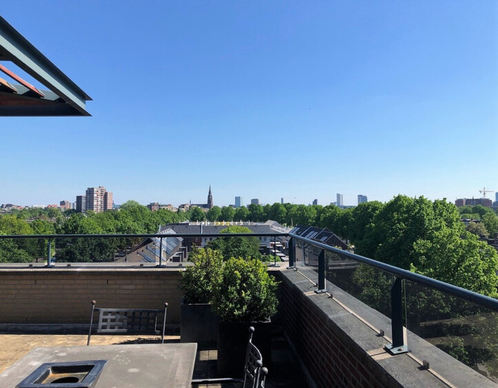 Unique penthouse on the 5th floor (approx. 145 m2), with 3 bedrooms, a large roof garden all around with very special (panoramic) views on the southwest-facing tierrace (100 m2). Storage room and private parking place in the parking garage.