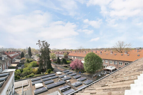 Alle ramen, zowel in keuken als woonkamer, hebben een draai-kiepsysteem en kunnen dus allemaal opengezet worden met zicht over diverse achtertuinen en in de verte de High Tech Campus.