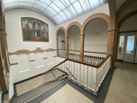 Centrale entree in de monumentale hal en gang naar appartement op de 1e etage: