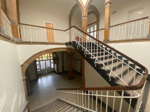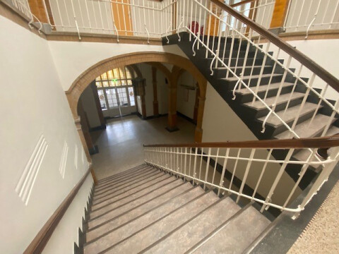 Centrale entree in de monumentale hal en gang naar appartement op de 1e etage: