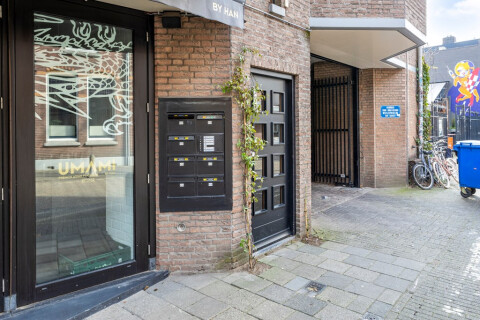 Aan de winkelstraat ‘Kleine Berg’ is de centrale ingang met brievenbussen en bellentableau. Er is toegang tot het trappenhuis naar de appartementen en de bergingen (souterrain) en de lift.