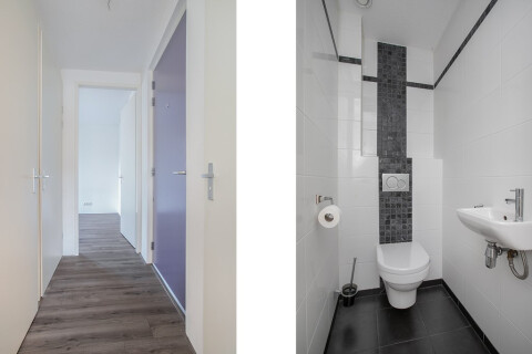 Portiek naar appartementen. Entree/hal met laminaatvloer en videofoon. Geheel betegeld toilet met hangcloset, fonteintje en afzuiging. Meterkast (8 groepen, 2 aardlekschakelaars) en unit mechanische ventilatie. Badkamer met tegelvloer en betegelde wanden, inloopdouche, wastafel, wasmachine-aansluiting en boiler. Slaapkamer met laminaatvloer. Woonkamer met laminaatvloer en stucwerk wanden. Open keuken in rechte opstelling voorzien van keramische kookplaat, afzuigkap, oven/magnetron, koelkast en vaatwasser.