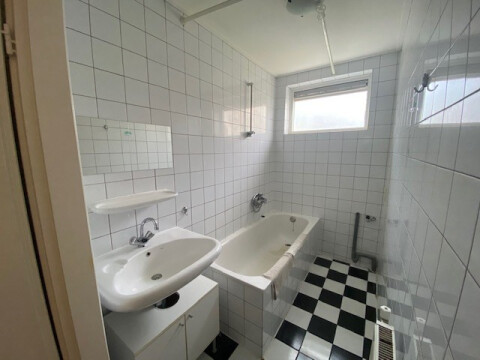 De aparte ruime badkamer is voorzien van een bad, wastafel en aansluiting wasmachine.