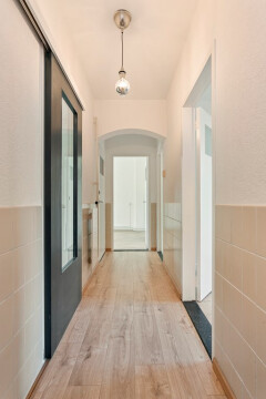 Entree, hal met laminaat, wanden en plafond voorzien van stucwerk, separaat modern toilet met fonteintje, deur naar keuken, slaapkamer en woonkamer.