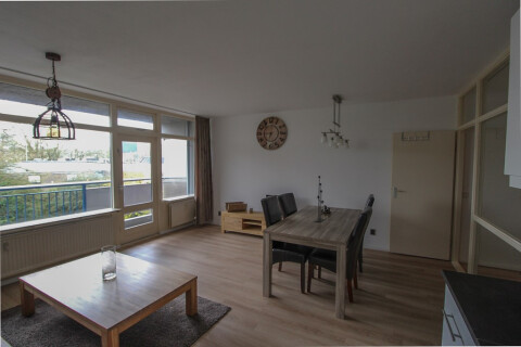 Ruime lichte woonkamer met een balkon over de gehele breedte van de woning.