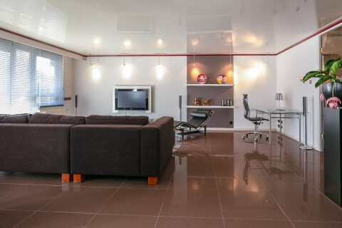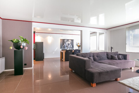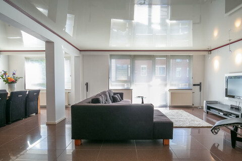 Zeer royale living welke is verdeeld in een eet-, zit-, en werkhoek.