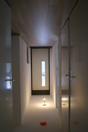 Hal met modern licht betegeld toilet met zwevend closet en fonteintje.