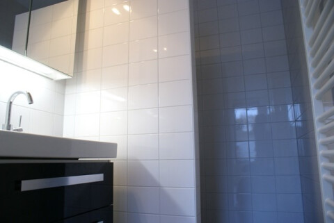 Slaapkamer voorzien van laminaatvloer en aansluitend badkamer met vaste wastafel met fraaie ombouw en inloopdouche.