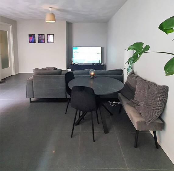 De woonkamer (L-vorm) is voorzien van een moderne tegelvloer en de wanden zijn voorzien van strak stucwerk. De ramen zijn voorzien van luxaflex. In de woonkamer bevindt zich tevens de moderne inbouwkeuken voorzien van: granieten aanrechtblad, 4-pits gaskookplaat met moderne rvs afzuigkap, rvs spoelbak met mengkraan, combi magnetronoven, en een grote koelkast met vriesvak. Onder het aanrechtblad is de wasmachine geplaatst.