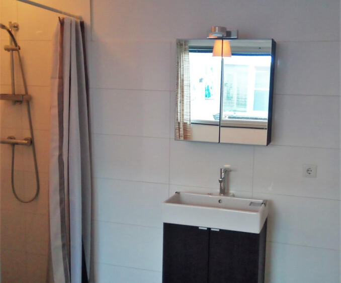 De ruime slaapkamer is groot genoeg voor een 2-persoons ledikant. In de slaapkamer bevindt zich tevens de inloopdouche (voorzien van thermostaatkraan) en een wastafel met spiegel.