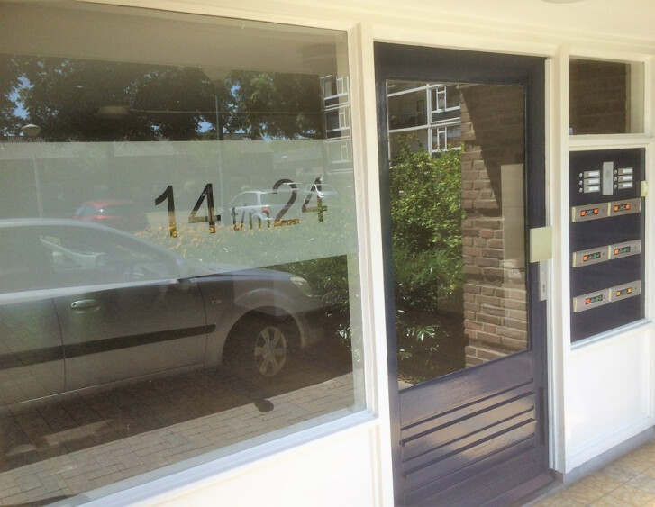Ingang op de begane grond waar zich het bellentableau, de berging en de brievenbussen bevinden.
