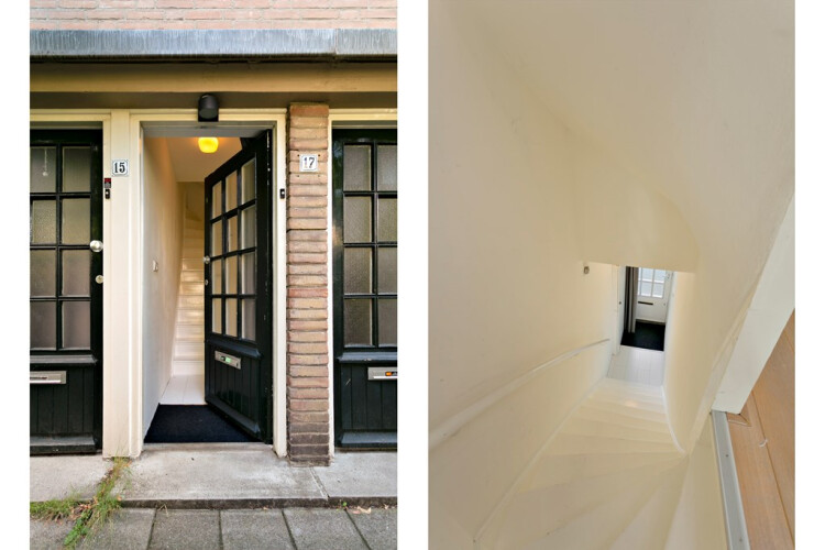 Entree met stucwerk wandafwerking, meterkast en trapopgang naar de 1e verdieping